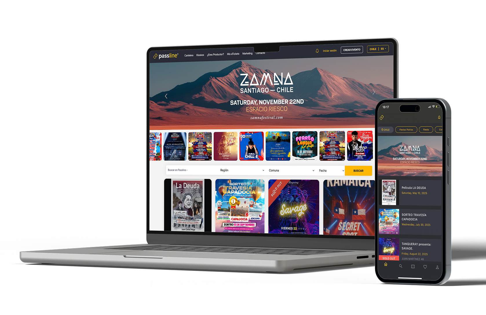 Tu evento se integra automáticamente al ecosistema de Passline, apareciendo en su web y app, junto a los eventos más importantes.